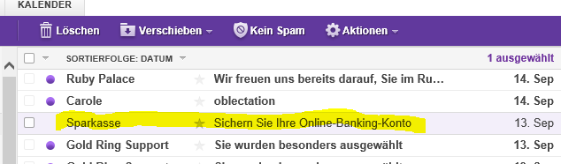 Ein praktisches Beispiel: Ich habe heute morgen in den Spam-Ordner meines Yahoo-Kontos geschaut, auf der Suche nach einer interessanten Beispiel-Mail. Und tatsächlich, es liegt dort eine E-Mail von der Sparkasse mit dem Betreff „Sichern Sie Ihre Online-Banking-Konto“ (zum Vergrößern der Bilder einfach draufklicken):