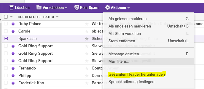 Dazu markiere ich die entsprechende Mail, gehe auf „Aktionen“ und wähle den Menüpunkt „Gesamten Header herunterladen“: