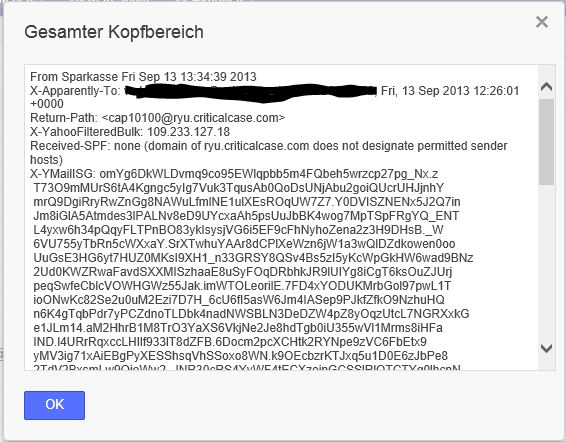 Solche Mails sollte man eigentlich nicht aufmachen, sondern gleich löschen, aber meine Neugierde überwiegt. Die E-Mail enthält, wie erwartet, den Text einer typischen Phishing-Mail. Ich werde darin aufgefordert, auf einen Link zu klicken, um mich mit dem neuen Sicherheitssystem der Sparkasse zu verbinden und Angaben zu meinen Kontodaten und Online-Zugängen zu machen. Ich klicke nicht auf den Link, da ich mir kein virenverseuchtes Zeugs auf den Rechner laden möchte. Statt dessen sehe ich mir den E-Mail-Header an.