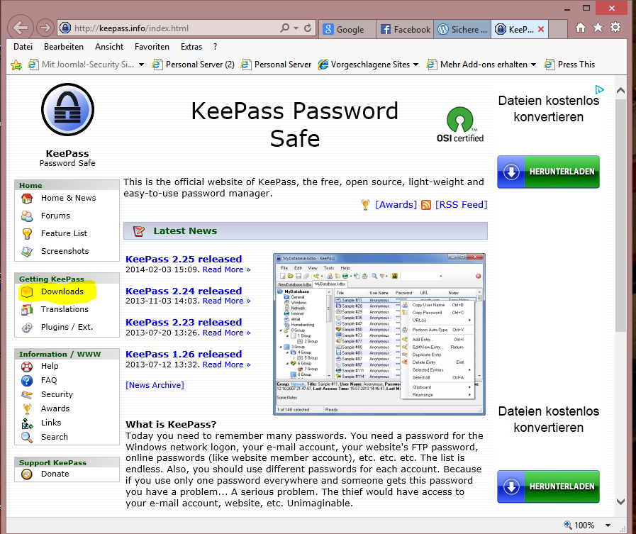 Die Webseite von KeePass ist englischsprachig. Bei Aufruf der Seite leuchten einem auf der rechten Seite gleich zwei grüne Herunterladen-Buttons an. Aber Achtung, bei diesen Buttons handelt es sich um eine Werbeanzeige. Wenn man dort drauf klickt, dann lädt man sich in diesem Fall ein Konvertierungsprogramm, aber nicht das gewünschte Passwort-Verwaltungsprogramm herunter. Dies ist für einen Laien im ersten Moment nicht ersichtlich, aber den Machern der Webseite sei verziehen: Da KeePass kostenlos ist, wird versucht, auf diese Weise Einnahmen zu erzielen.